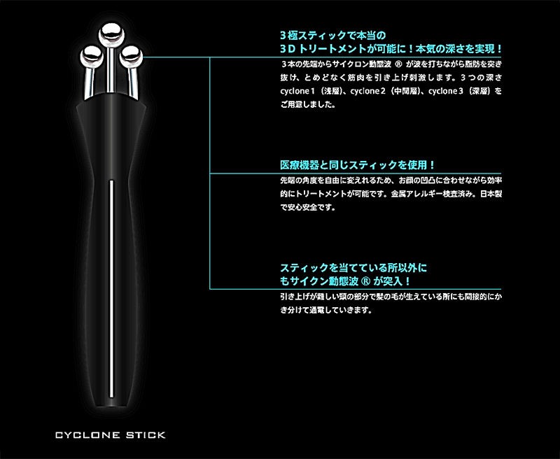サイクロン動態波とは、業界初の医療用の立体動態波をエステでも使えるように開発!3極間を波形が動きながら脂肪を突き抜け奥へ刺激していきます。